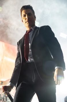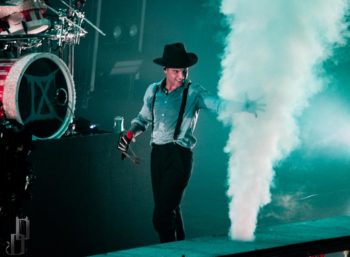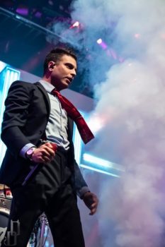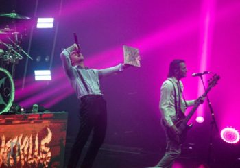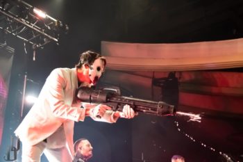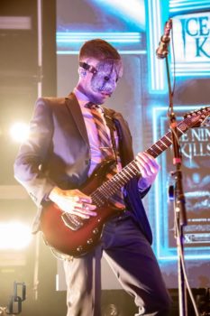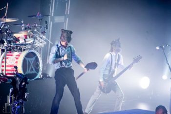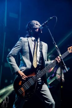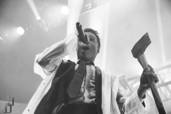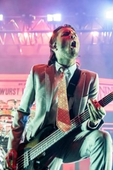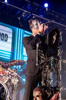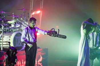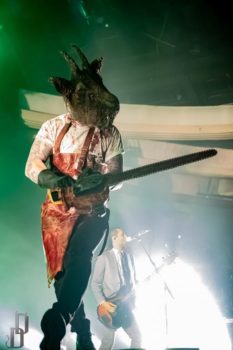 One thing the band never fails to deliver is a theatrical performance, and this night on the Trinity of Terror tour was no exception. Special guests graced the stage with their presence dressed as characters out of horror movies (or victims for the band), such as a butcher for the song “Wurst Vacation.” The members also wear costumes and masks according to the song they’re playing, such as suits and raincoats for “Hip to be Scared,” a track inspired by American Psycho.